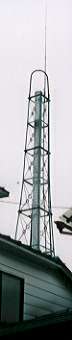 材質は煉瓦や土管、ブリキ製や最近のものでは鉄筋コンクリートなど様々ですが、東京などで電気ボイラー等を使用している銭湯では、シンボルとも言える煙突が無いところも珍しく無くなっているようです。 ところで煙突のてっぺんに、よく大きなブラシの様な物がぶら下がっているのを見かけたことがないでしょうか?そうです。ご想像のとおり、あれは煙突掃除の時に使うブラシなのです。使用する燃料の種類にも依りますが、月に1〜2度から半年に1度位、あのブラシを使って煙突の中のすす払いをします。 掃除の度にブラシを持って煙突を登るのは大変なので、最初からてっぺんに着けておいて滑車で掃除できるようにしてある訳です。それでも時々、いや、しょっちゅうロープが絡んだりしますから、結局煙突を登る羽目になりますが・・・ |