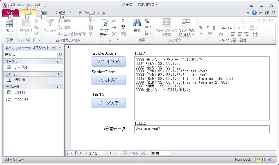 Accessをデータ回収サーバーとして用いる場合など、シリアルポート等(RS232C)の代わりにTCP/IPを通信回路として使いたいことがあります。このような場合の実装方法の一つを例示します(但し、あくまでもTCP/IPテスト用と考えてください)。