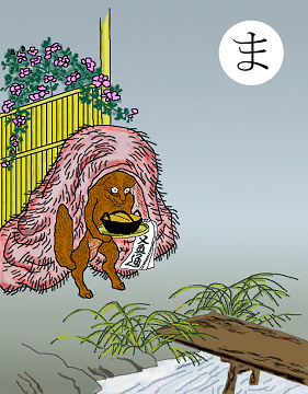〈読み札〉 「狢(むじな)狸(たぬき)は人に化ける」 〈妖怪名〉 「むじな」 〈解説〉 「同じ穴のむじな」ということわざがあるが、むじなとたぬきは違うという認識があった。だからこそ、同じ穴のむじなということわざができたのである。「たぬきと同じ穴に棲むむじな」という意味である。こいつも狸と同じで人に化けるというわけである。この絵の解説には、「ある辻堂に歳をとったムジナが僧に化けてお勤めを怠らなかったが、食後についうっかりうたた寝をしてしまい、尾を出してばれてしまった」とある。人を化かすといってもお坊さんに化けてお勤めしているというのはそれはどういうことなのか。 |
